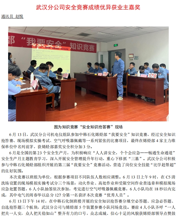武漢分公司安全競賽成績優(yōu)異獲業(yè)主嘉獎