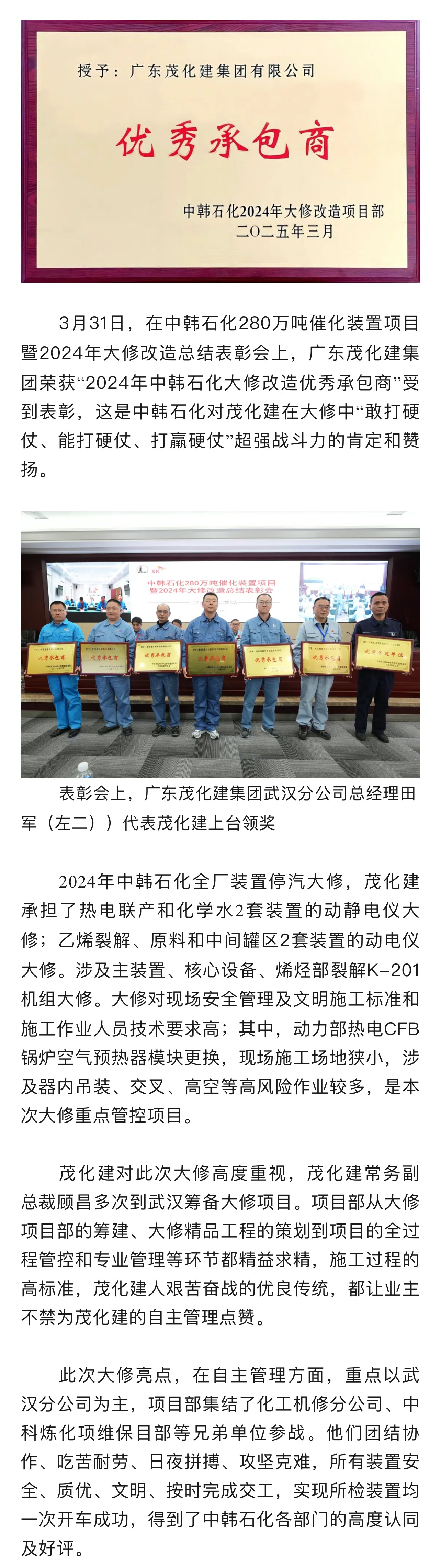 喜報|榮獲中韓石化2024年大修改造 “優(yōu)秀承包商”稱號